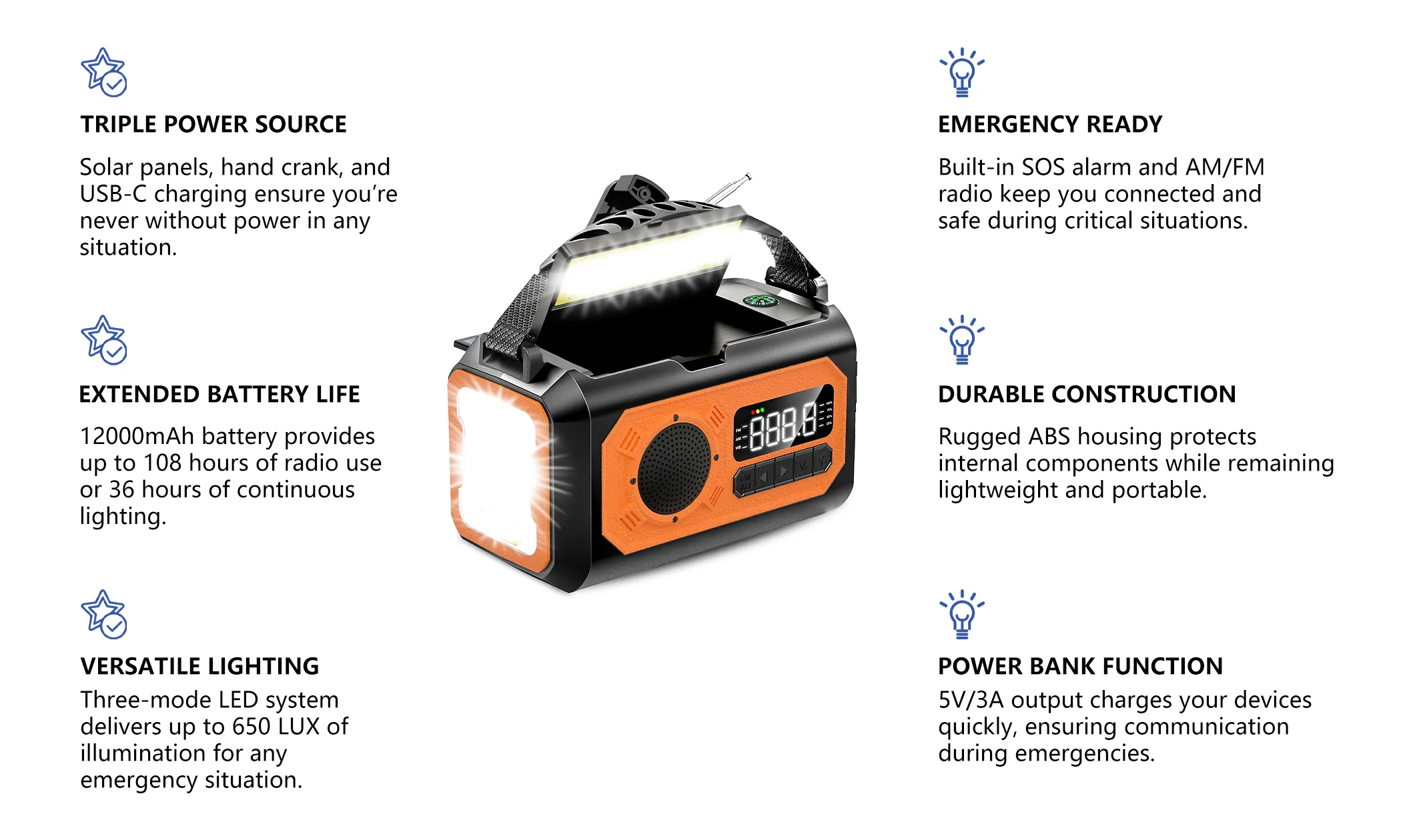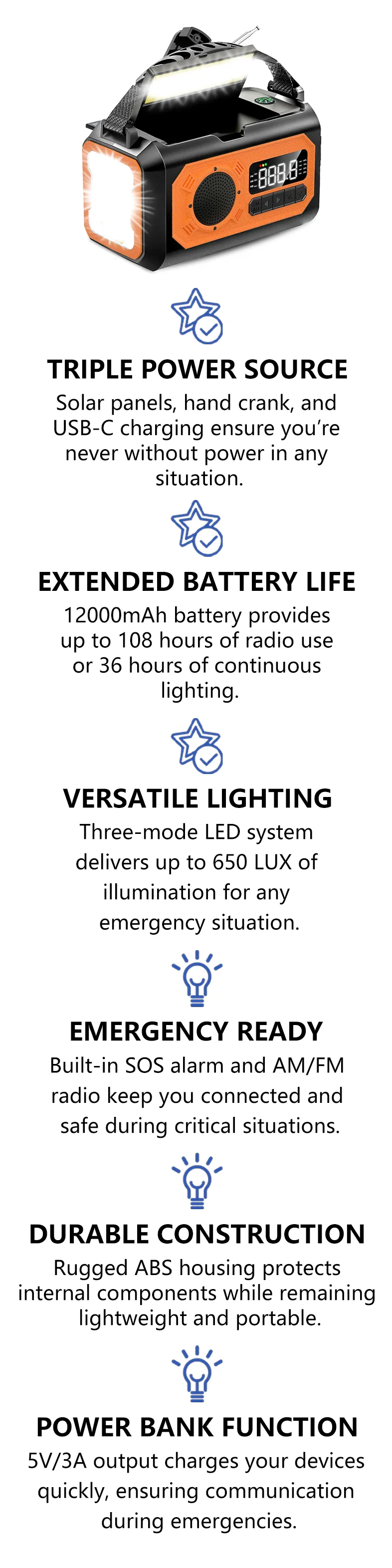 - Multiple Power Sources (Crank + Solar + Type-C) — Stays powered during outages or outdoor use.